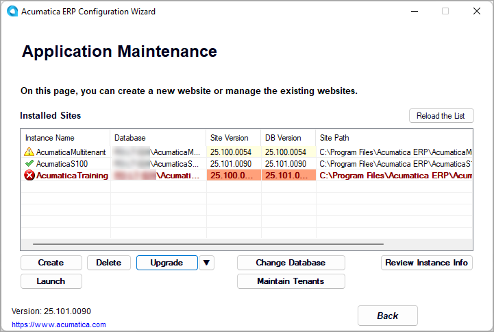 - Yellow triangle with exclamation point: The instance and the instance database are outdated. (That is, the version of the application instance is the same as the version of the database and is older than the version of the installed MYOB Acumatica ERP Configuration Wizard.) The application instance will still work, even if the instance and database are out of date.