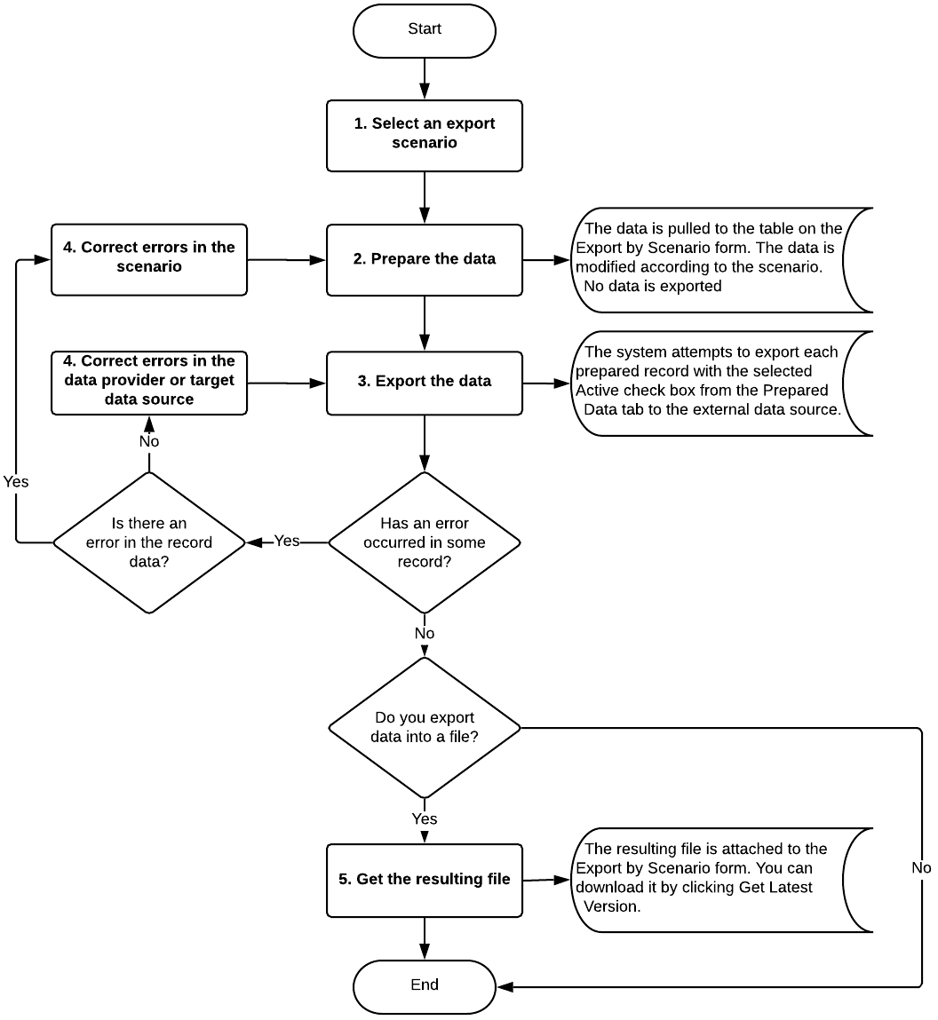 Make sure each record has the check box in the Processed column on the Prepared Data tab of the Export by Scenario form selected, which means that this record has been successfully exported. The result of export may include errors, which are indicated by the icon on the form toolbar.