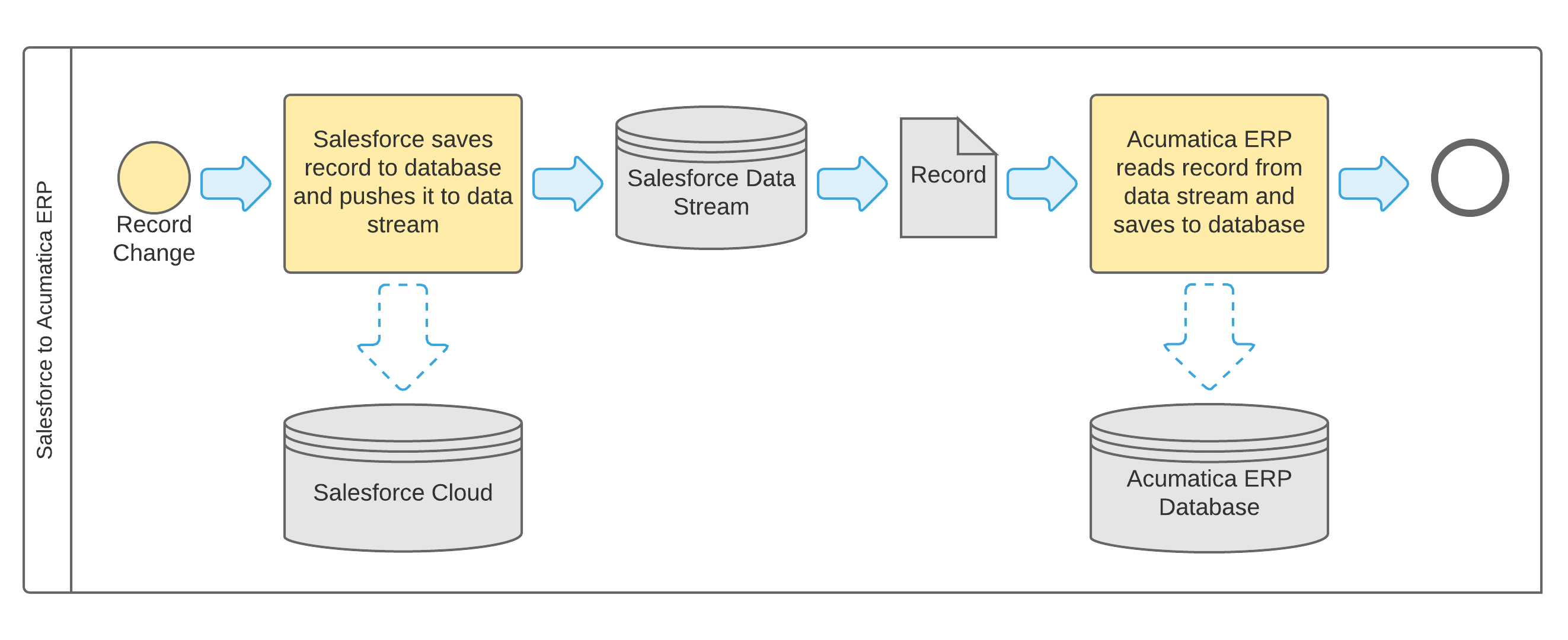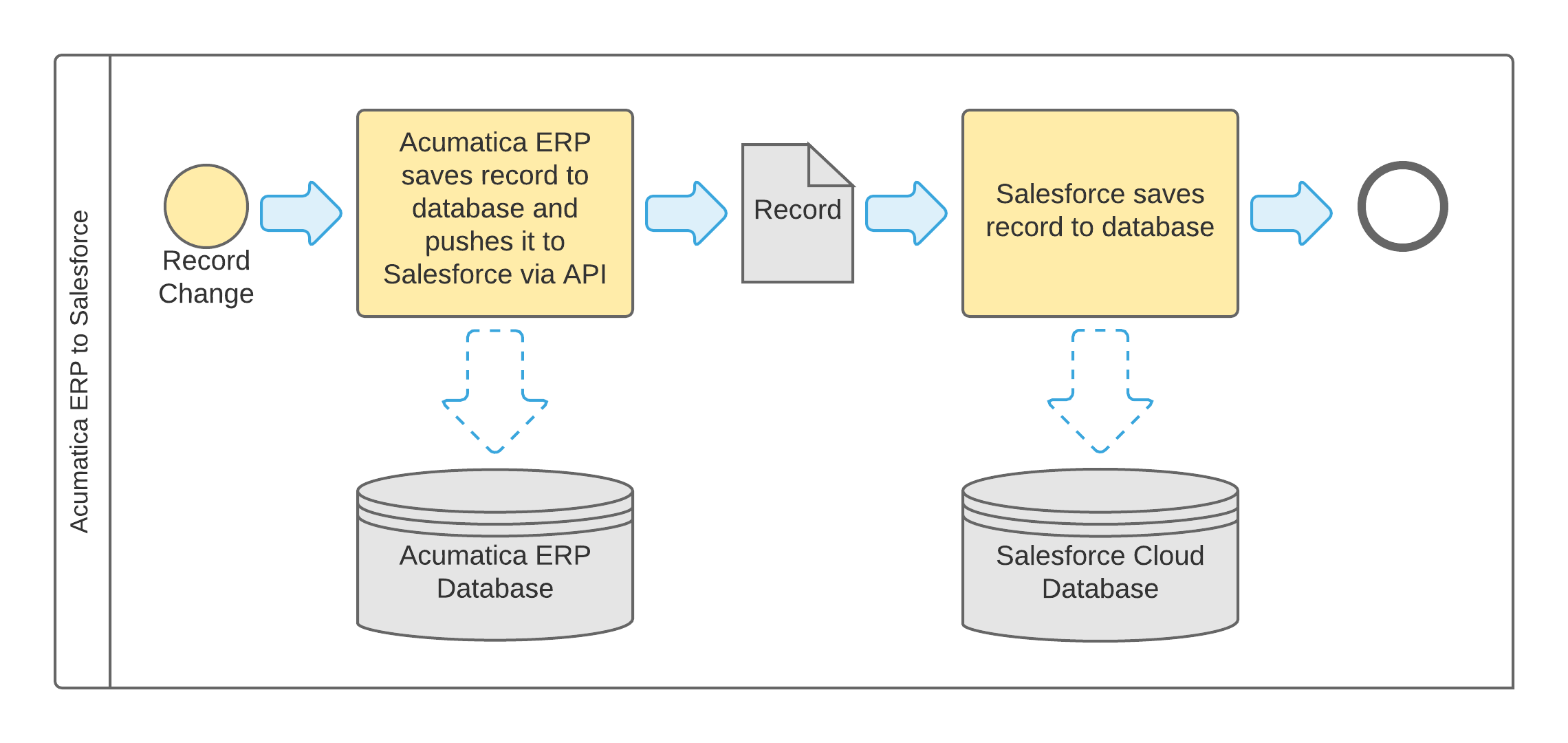 When a user modifies, creates, or deletes a record in Salesforce, the system pushes the record into the data stream. MYOB Acumatica picks up the record from the data stream and searches for the same record in MYOB Acumatica database by using the Salesforce record identifier. If a record is found, the synchronization solution updates the data or deletes the record. If no record is found, the synchronization solution creates a new record.