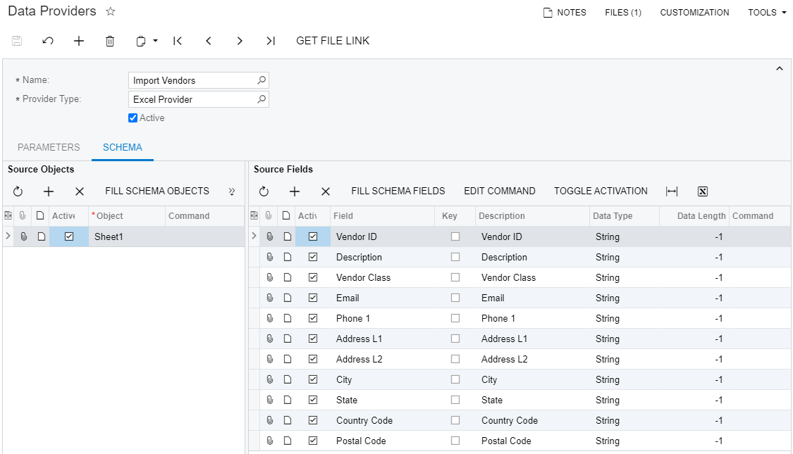 On the Data Providers (SM206015) form, create an Excel data provider for the Import_Vendors.xlsx file with the name Import Vendors, as the following screenshot shows.