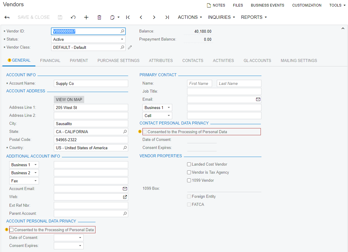 On the Import by Scenario (SM206036) form, select the Import Vendors scenario in the Summary area, and click Prepare & Import on the form toolbar. The records from the Excel file are imported into the system.