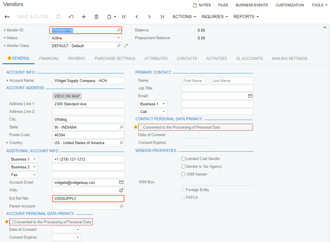 Review the results of the import on the Vendors (AP303000) form. You can see that the last vendor account now has the V000000108 vendor ID. You can also see that the previous vendor ID is now displayed in the Ext Ref Nbr. field, as the following screenshot shows.