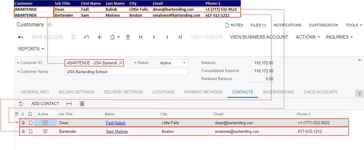 For example, suppose that you have a customer account with two contact details. In this case, the external data that you are going to import to MYOB Acumatica should include two records—one record with the customer ID and contact information for each contact detail. Such records should include a key field that the system uses to distinguish lines that belong to different records. The relationships between the external data and MYOB Acumatica objects on the Customers (AR303000) form are shown in the following screenshot.
