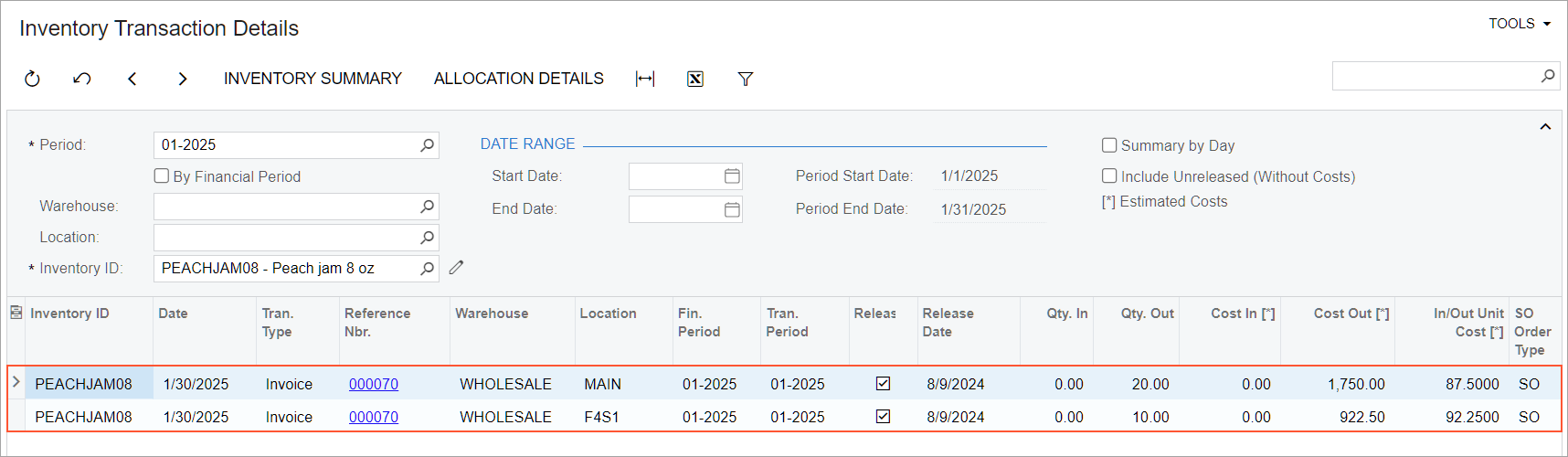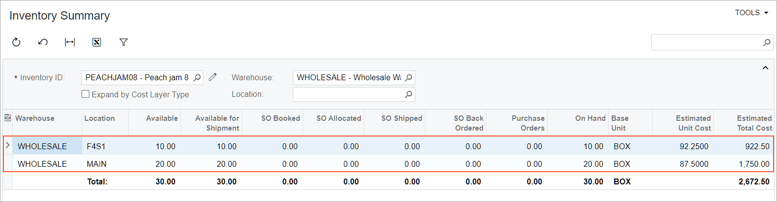 - On the Inventory Summary (IN401000) form, review the costs of the purchased jam at different warehouse locations.
