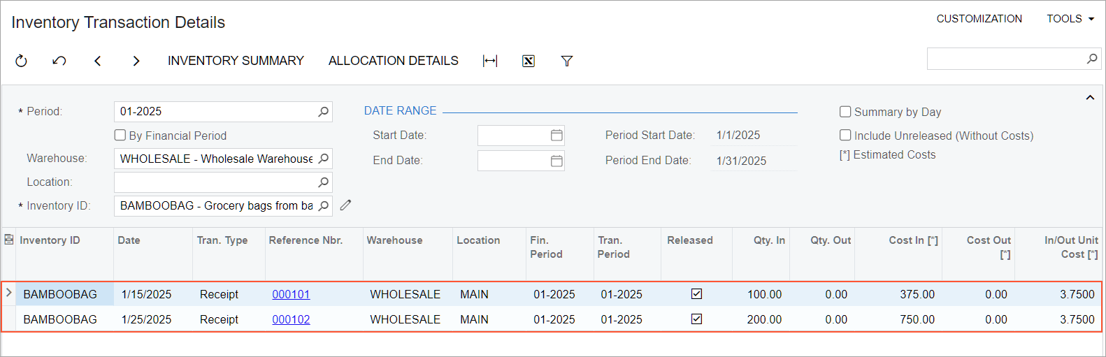 the receipt dated 1/15/2025 for 100 bags, the In/Out Unit Cost [*] is 3.75.