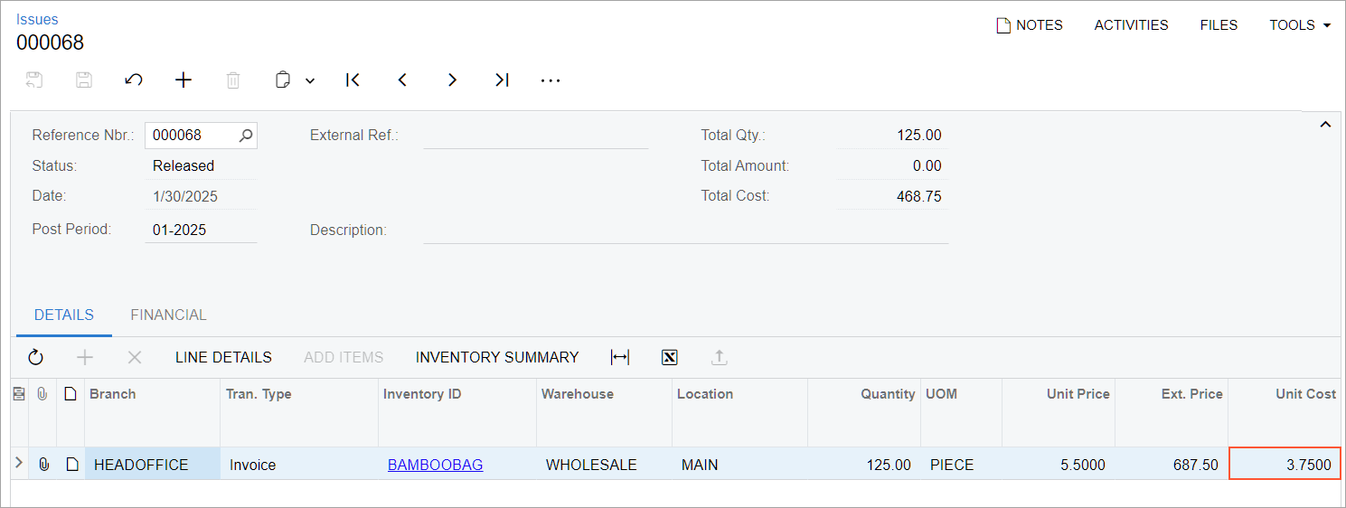 - On the Issues (IN302000) form, review the issue related to the sales order to see how the stock item has been issued and its cost has been calculated.