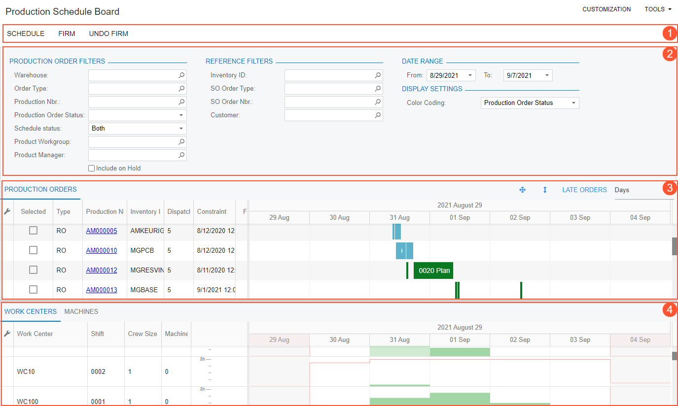 The Production Orders tab (in the upper pane) displays production orders and their schedules. This tab consists of the following parts, whose numbers correspond to those in the screenshot below: