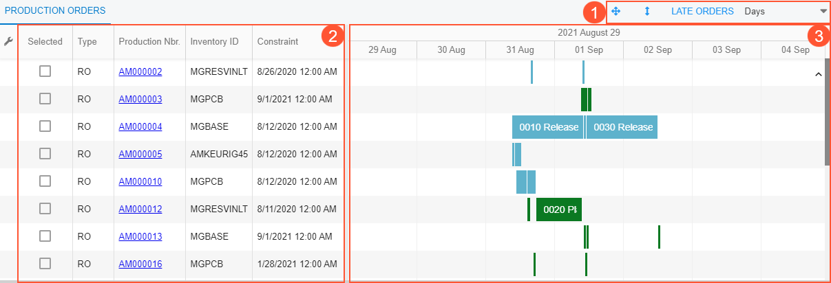 - The list of production orders. For descriptions of its columns, see Production Schedule Board.
