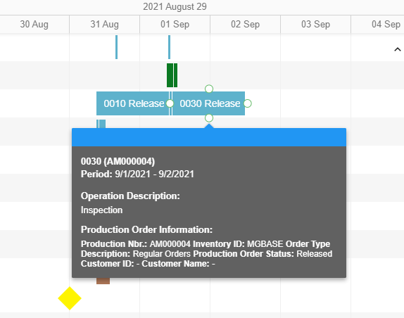 You can point to a graphical element and view the details of the scheduled operation and the related production order (see the following screenshot).