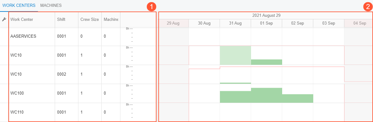 - The lower pane, which has the Work Centers and Machines tabs. These tabs contain lists of all work centers and machines, showing histograms with details about the available and scheduled capacity for each work center and machine. For more information, see the Work Centers and Machines Tabs (Lower Pane) section below.