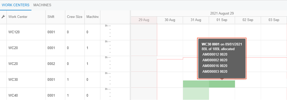 - The list of work centers (or machines on the Machines tab). For descriptions of the columns, see Production Schedule Board.