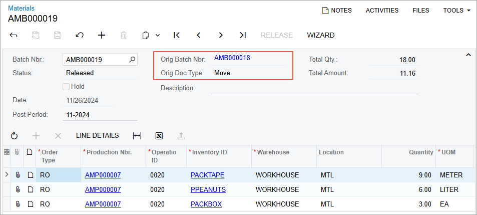 - On the Materials (AM300000) form, open the transaction for the materials needed for the packing operation with the total amount of $11.16 (as shown in the following screenshot).