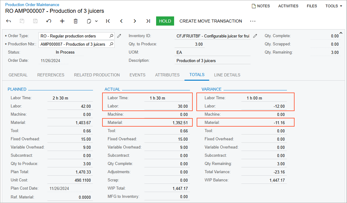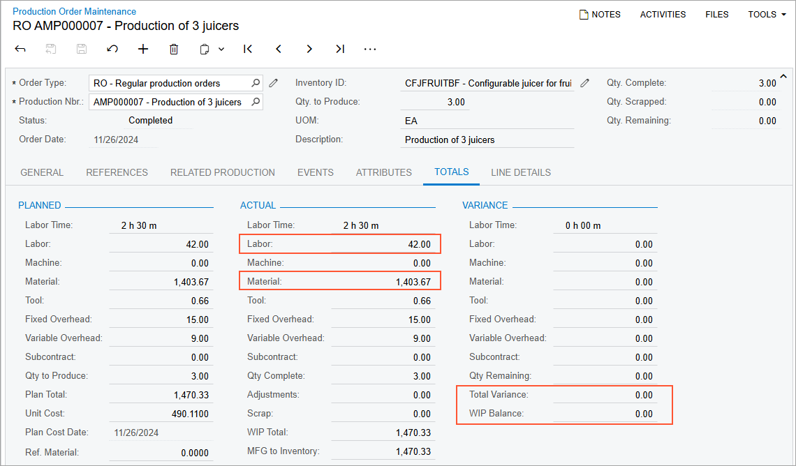 - On the Totals tab, review the production order balance