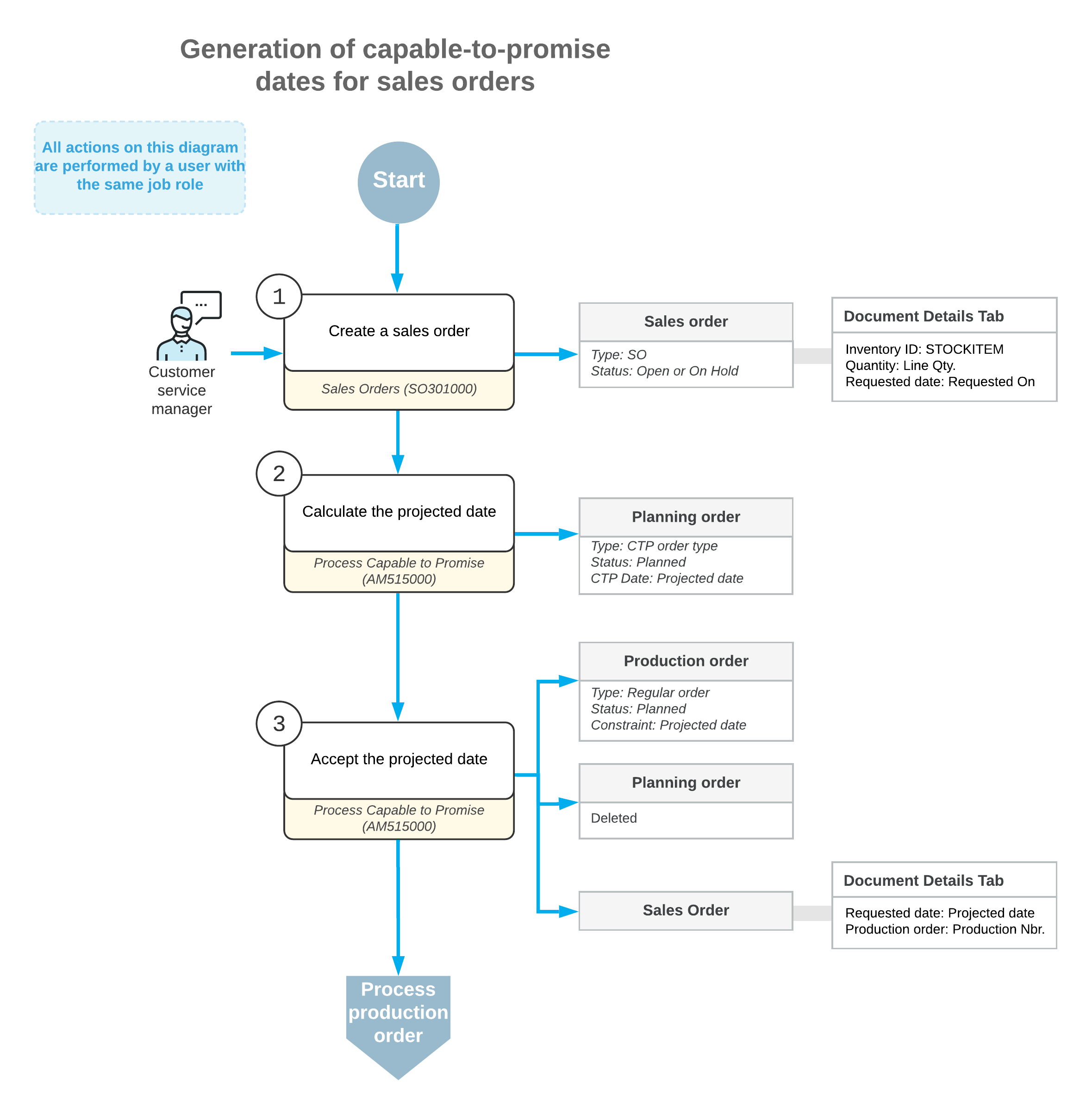 The typical workflow of generating capable-to-promise dates for sales orders involves the actions and generated documents shown in the following diagram.
