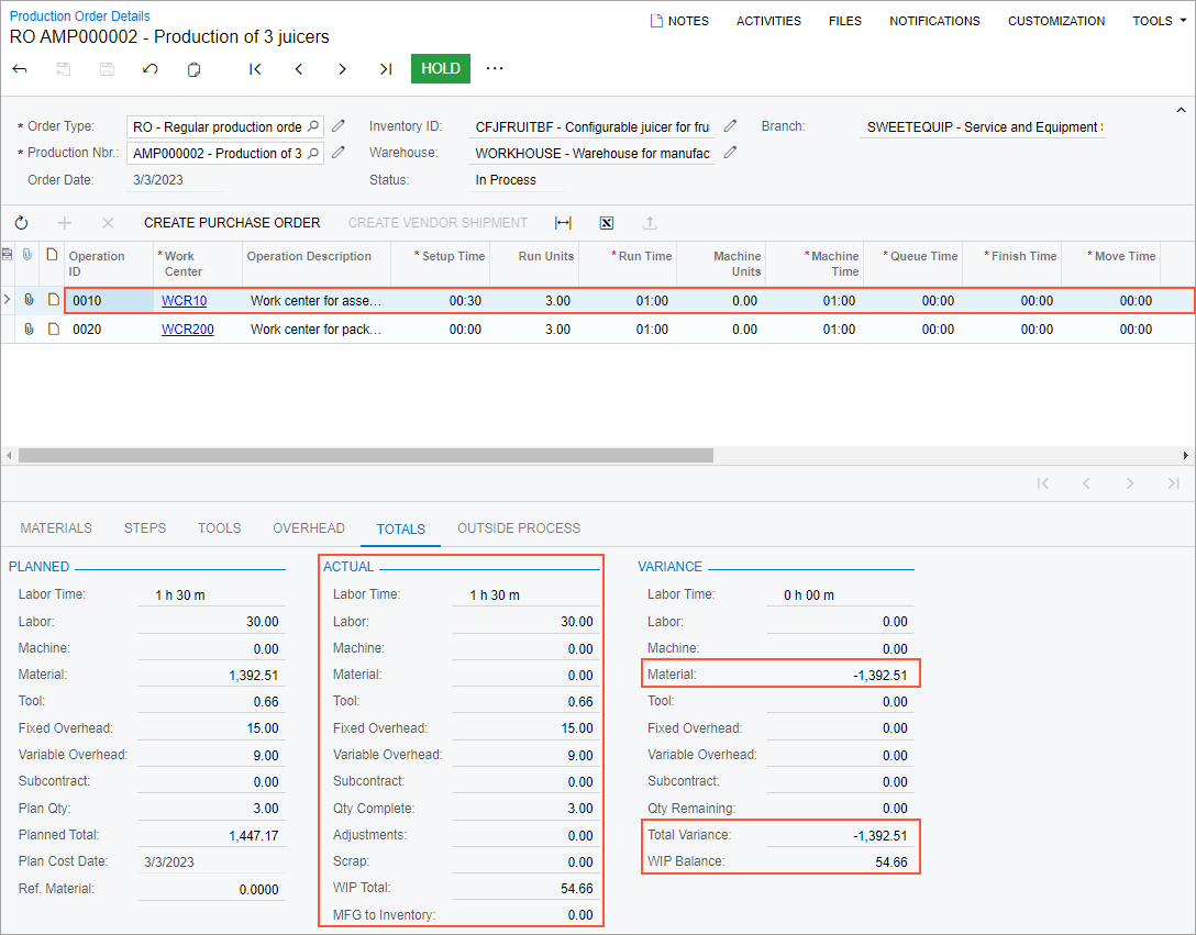 - On the Production Order Details (AM209000) form, review the production order balance after the assembly operation.
