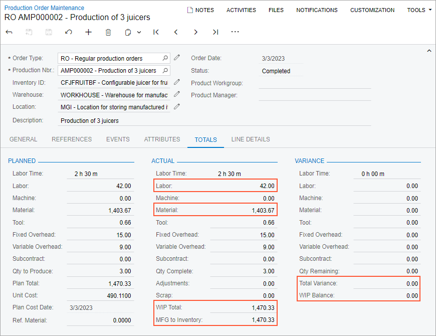 In this step, again acting as a production accountant, you will review the production order balance after you have recorded the completion of the packing operation for the remaining juicer. Do the following on the Production Order Maintenance (AM201500) form: