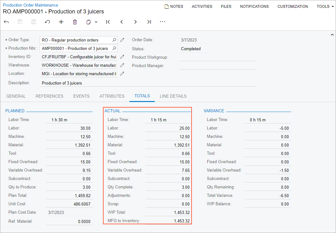 - In the MFG to Inventory box, the cost is 1453.32, which is the cost of the produced items that have been moved to stock. This cost differs from the planned item cost because the production employee spent less time for the juicer assembly. The system calculated this cost by using the Actual costing method so that it included only actual costs in the cost of produced items.