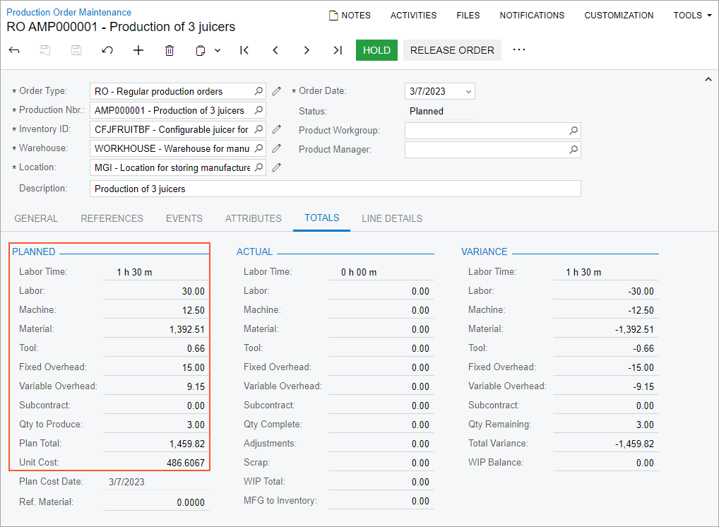 In this step, acting as a production accountant, you will review planned costs of the production order. Do the following on the Production Order Maintenance (AM201500) form: