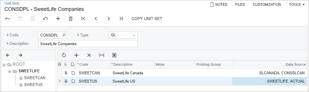 In this activity, you will first create a copy of the predefined Profit & Loss (GL635000) report by copying its row set, column set, and report definition. Then you will create a unit set so that you can filter the displayed data by company and to review the consolidated data for the entire SweetLife company.