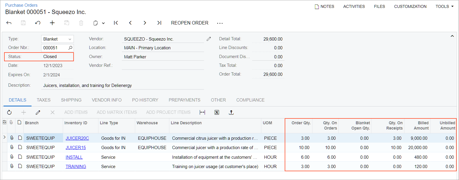 - On the Purchase Orders form, open the blanket purchase order with the Juicers, installation, and training for Delienergy description. Notice that the order has now the Closed status.
