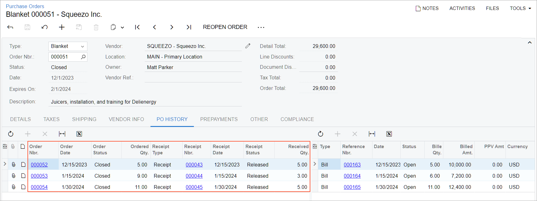 - Open the Juicers, installation, and training for Delienergy blanket purchase order on the Purchase Orders (PO301000) form.