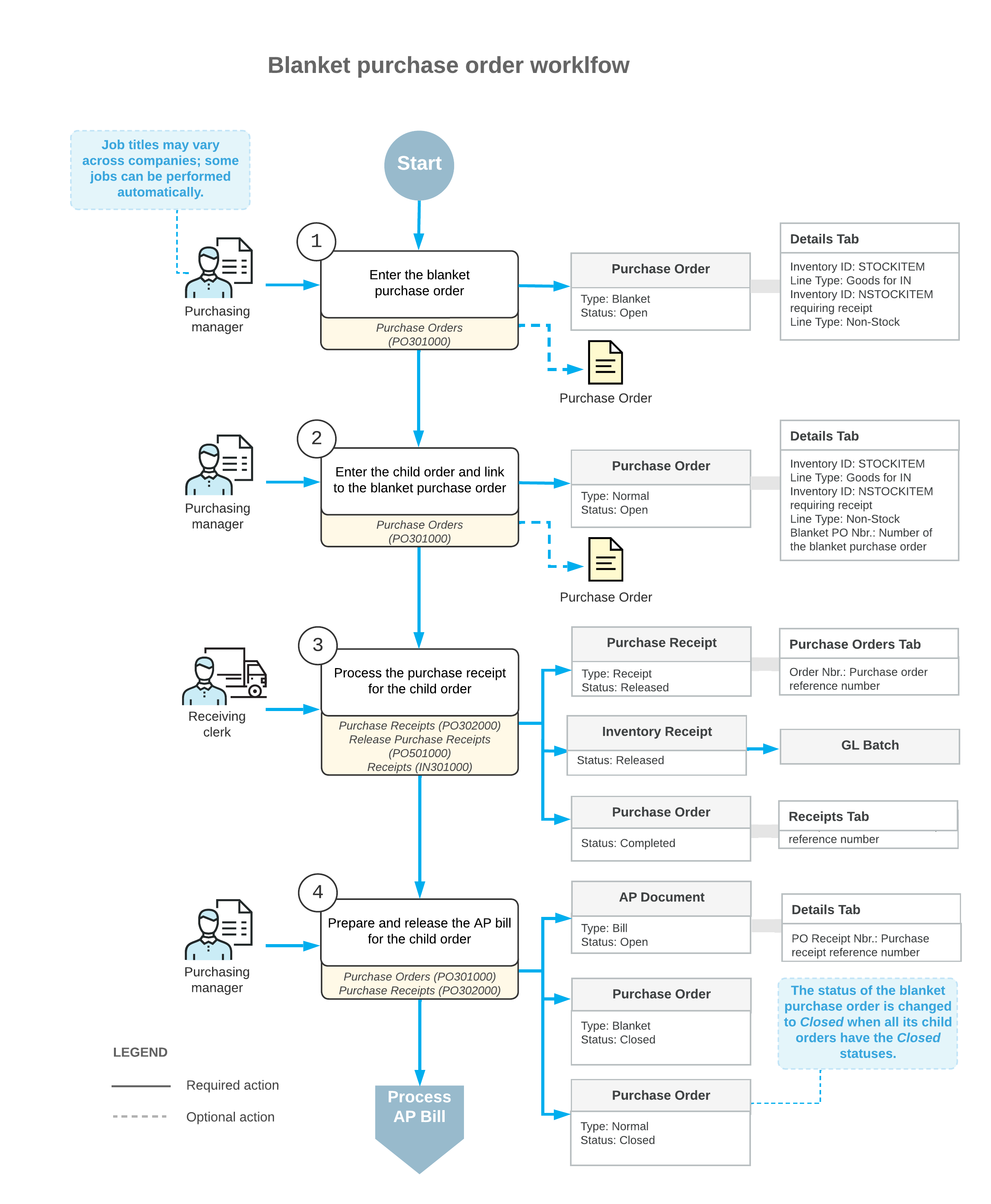 The general workflow of processing of a blanket purchase order involves the steps and generated documents shown in the following diagram.
