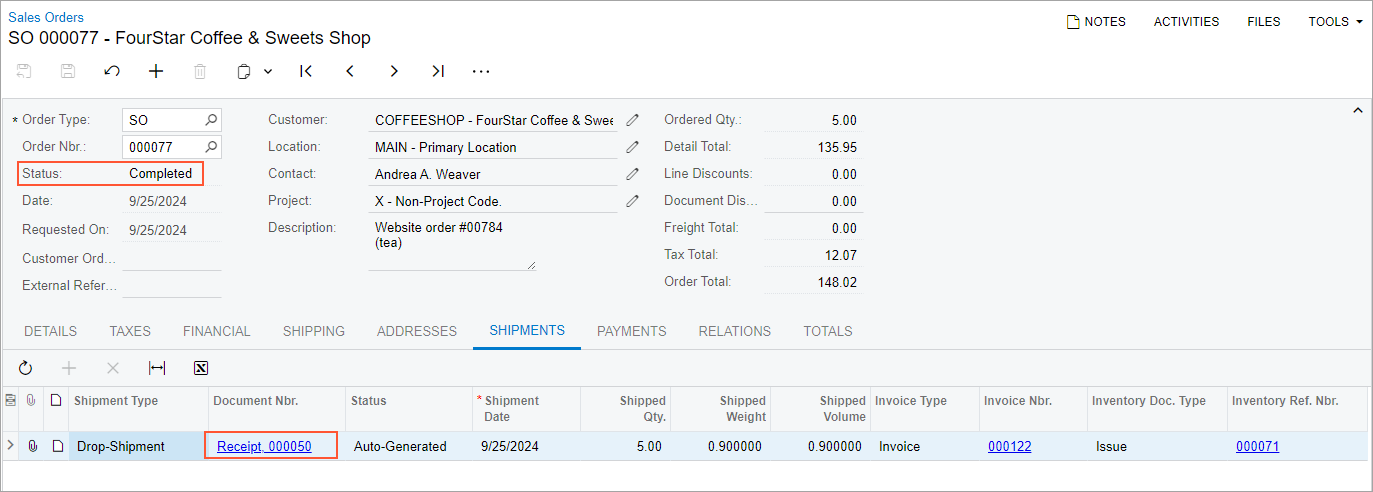 - On the Sales Orders (SO301000) form, open the sales order for the COFFEESHOP customer that you have created earlier in this activity.