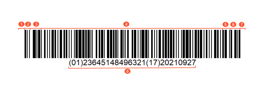 A GS1-128 barcode is composed of the following elements, from left to right and shown in the following graphic: