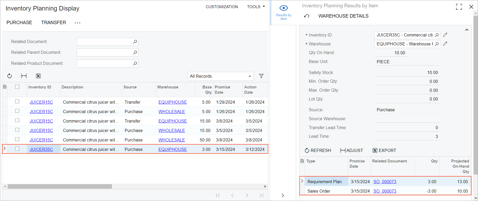 - On the Inventory Planning Display (AM400000) form, review the planning recommendations for the JUICER35C stock item based on the last execution of inventory requirements planning.