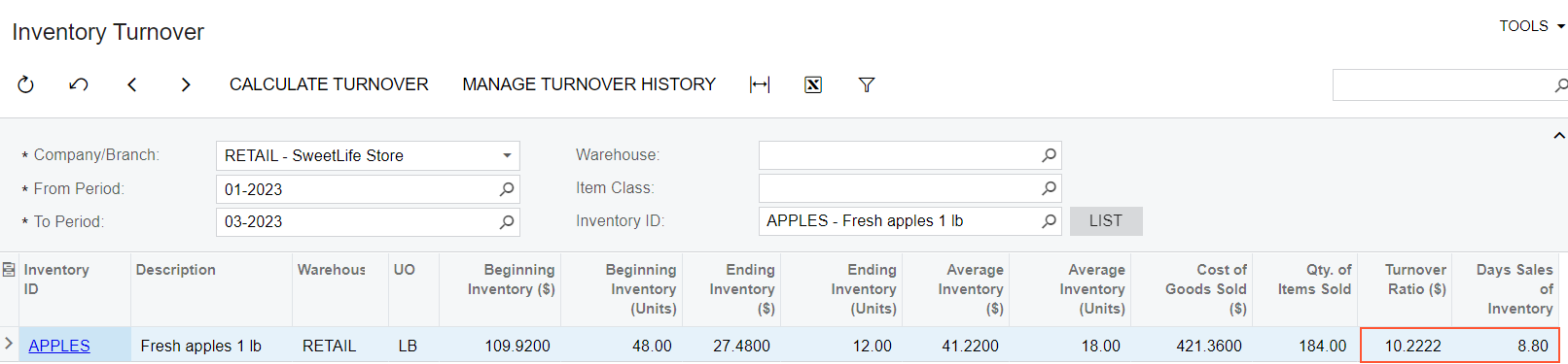 - In the only line left, review the details of the inventory turnover for the