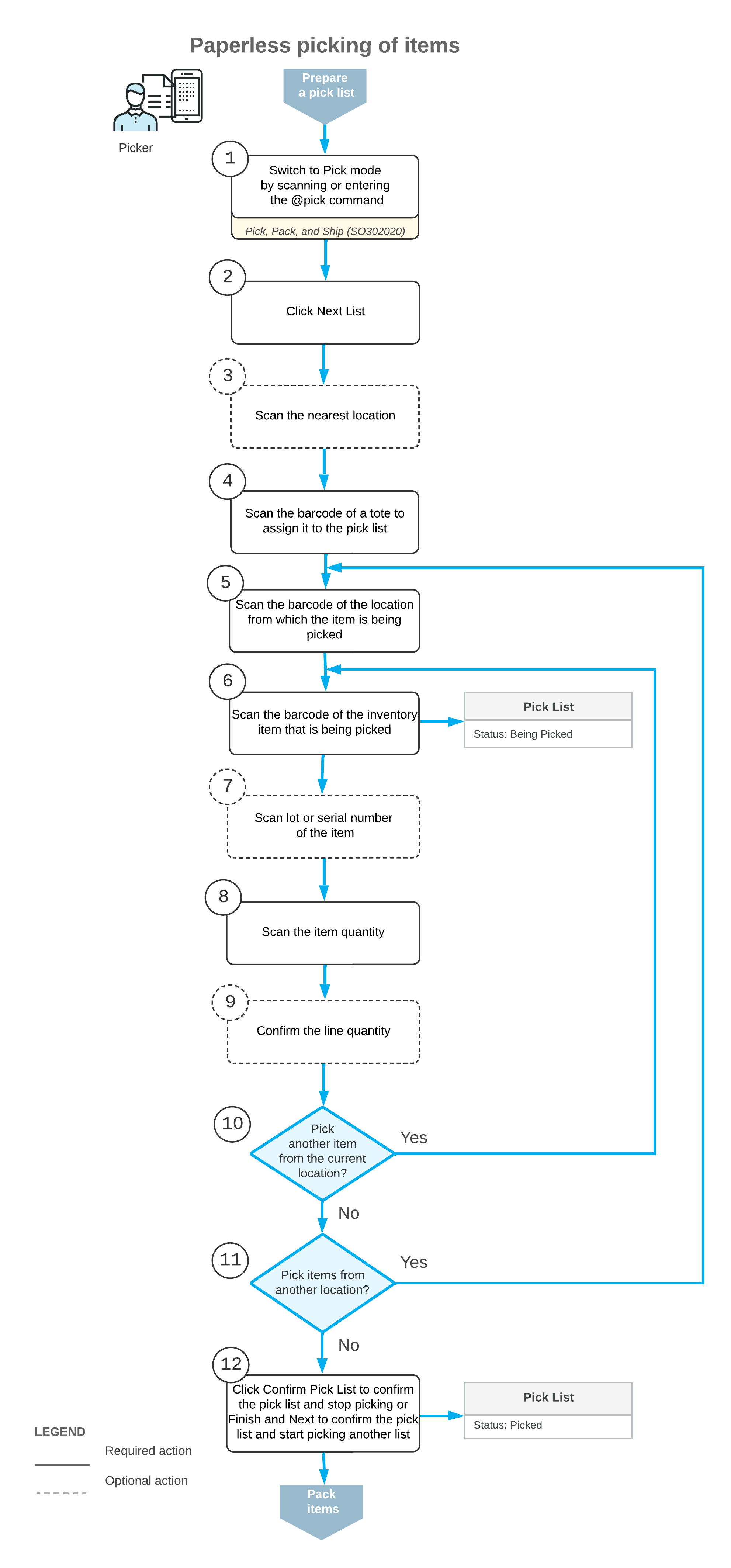 For simplicity, this topic will illustrate the workflow of paperless picking only for single-shipment pick lists. The paperless picking supports wave and batch pick lists too.