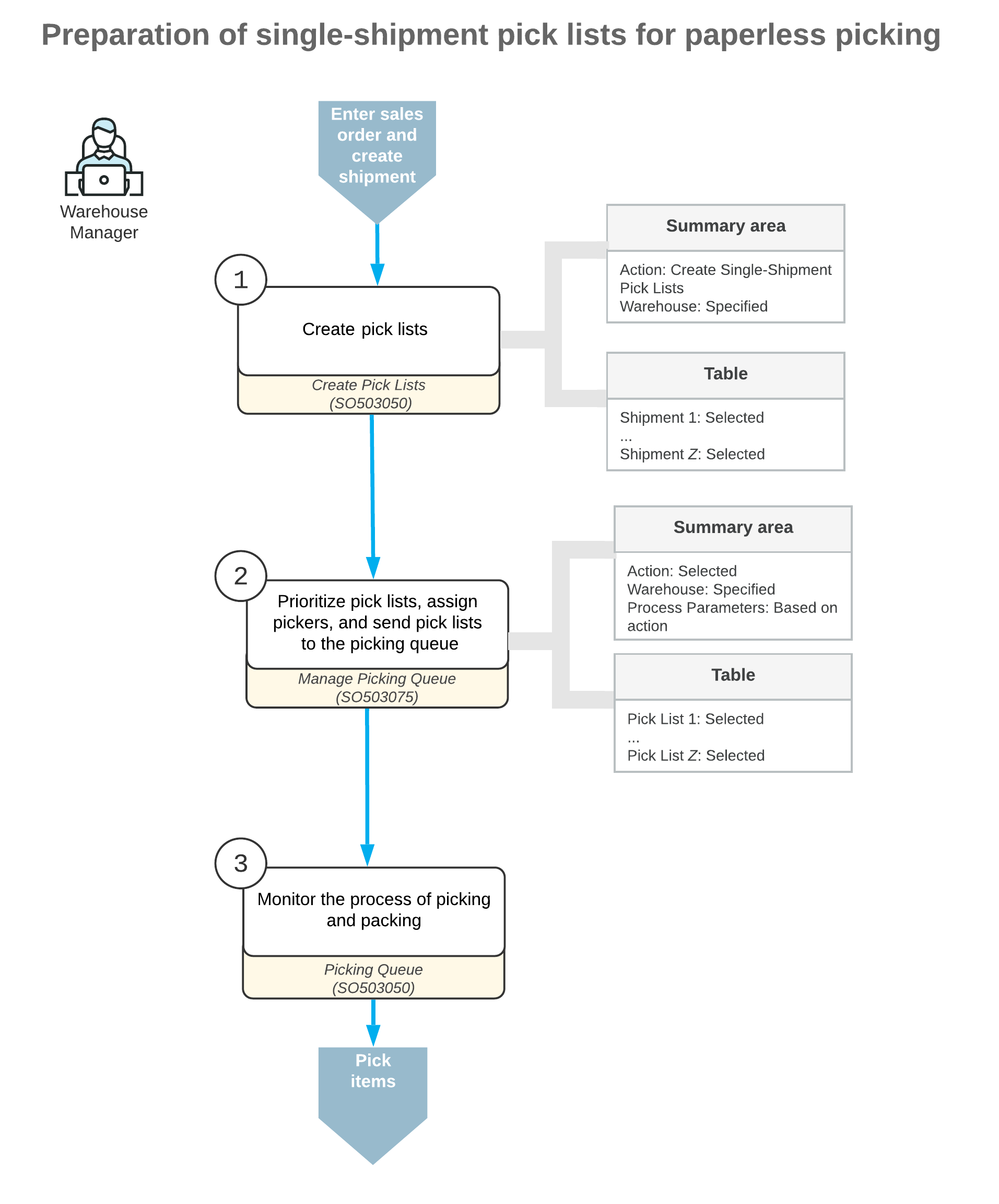 - A warehouse manager opens the Create Pick Lists (SO503050) form, selects the type of pick lists to be created and the shipments to be processed, specifies the process parameters, and creates the pick lists. Then on the Manage Picking Queue (SO503075) form, the warehouse manager assigns pickers and changes the pick list priority if required, and then sends the pick lists to the picking queue. After that, the warehouse manager opens the Picking Queue (SO503080) form and manages the process of picking and packing in live mode.