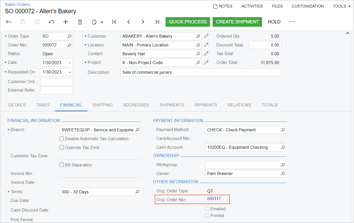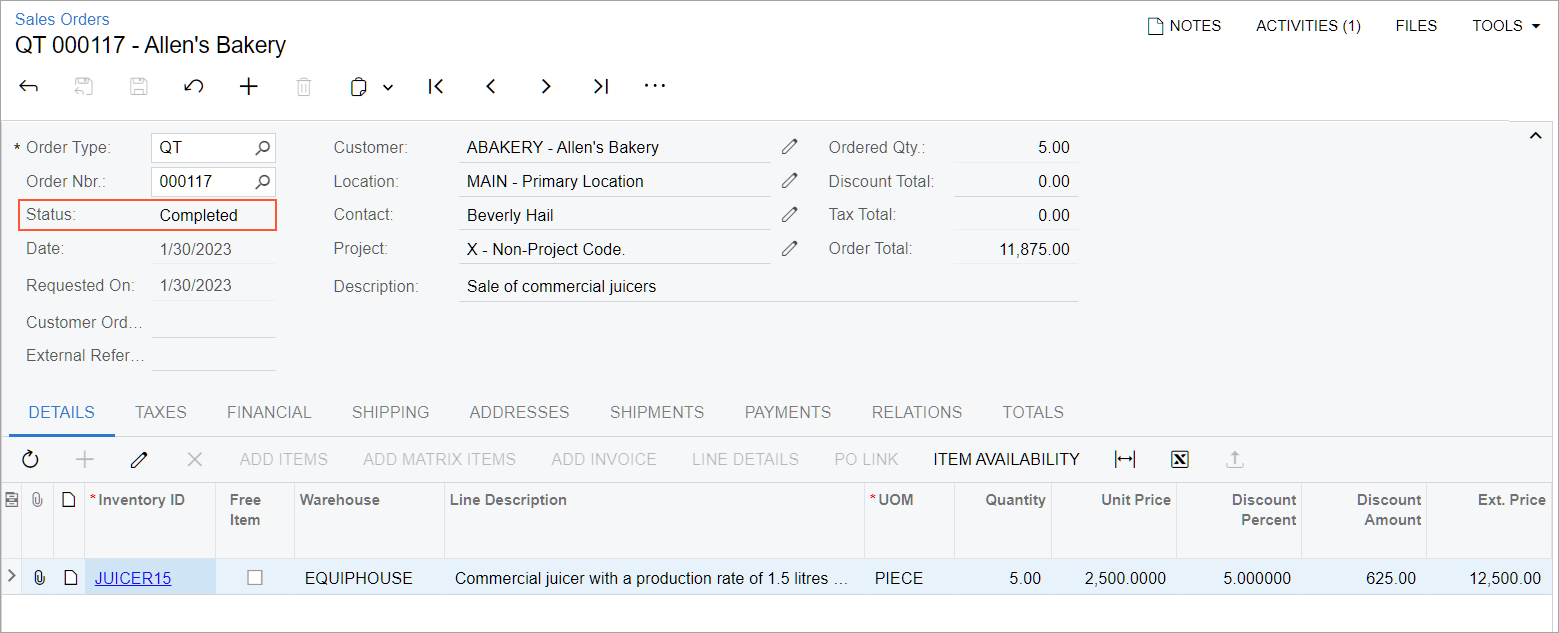 - While you are still viewing the Sale of commercial juicers quote on the Sales Orders (SO301000) form, on the form toolbar, click Copy Order.