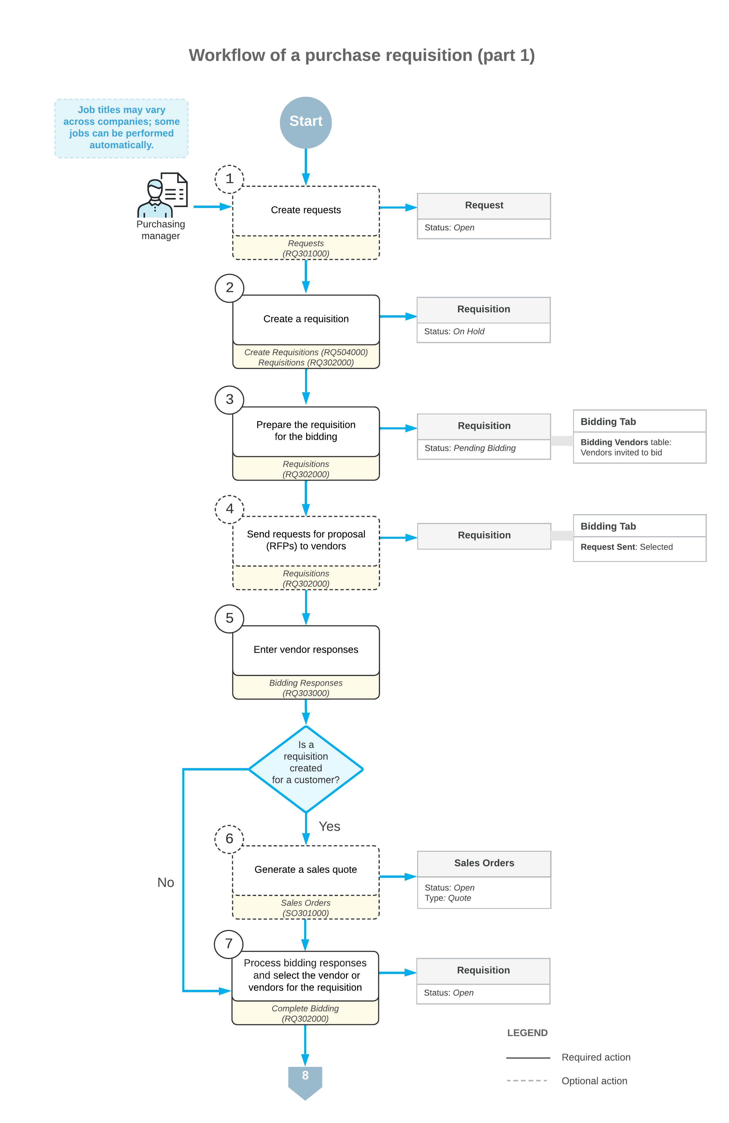 On the Requisitions (RQ302000) form, you add items for purchase and select the vendors from which the items will be purchased. The process of creating a requisition can begin differently depending on whether you have already created purchase requests on the Requests (RQ301000) form for the items to be included in the requisition: