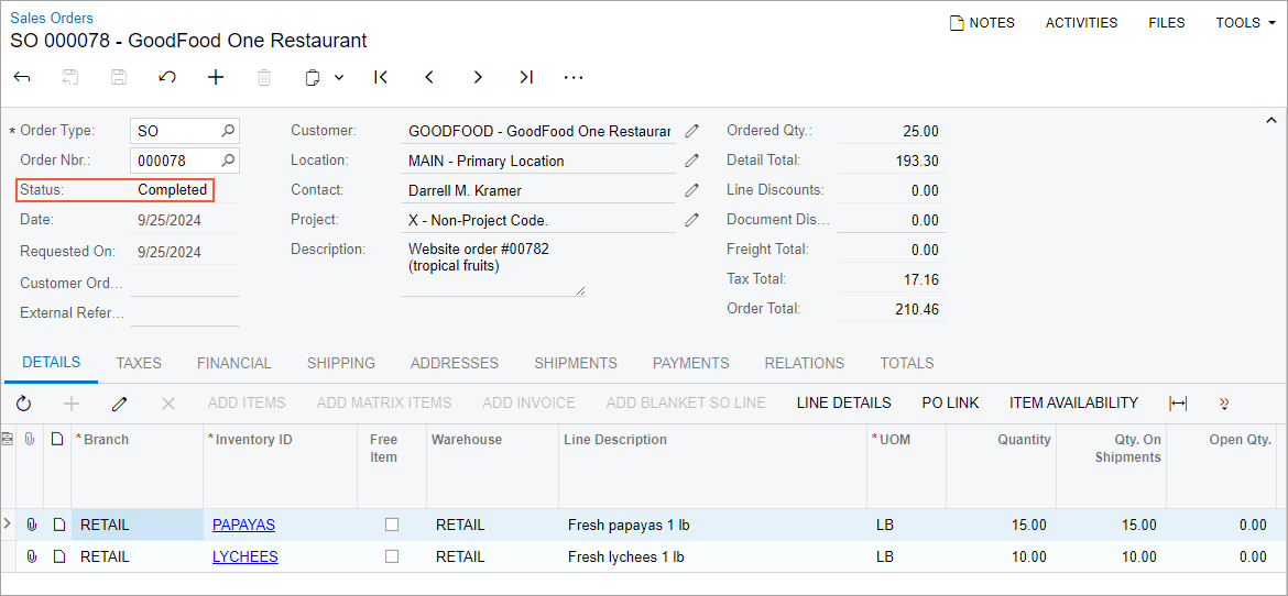 17. Return to the Sales Orders form with the Website order #00782 (tropical fruits) sales order for the GOODFOOD customer open, and notice that it has the Completed status, as shown in the following screenshot.