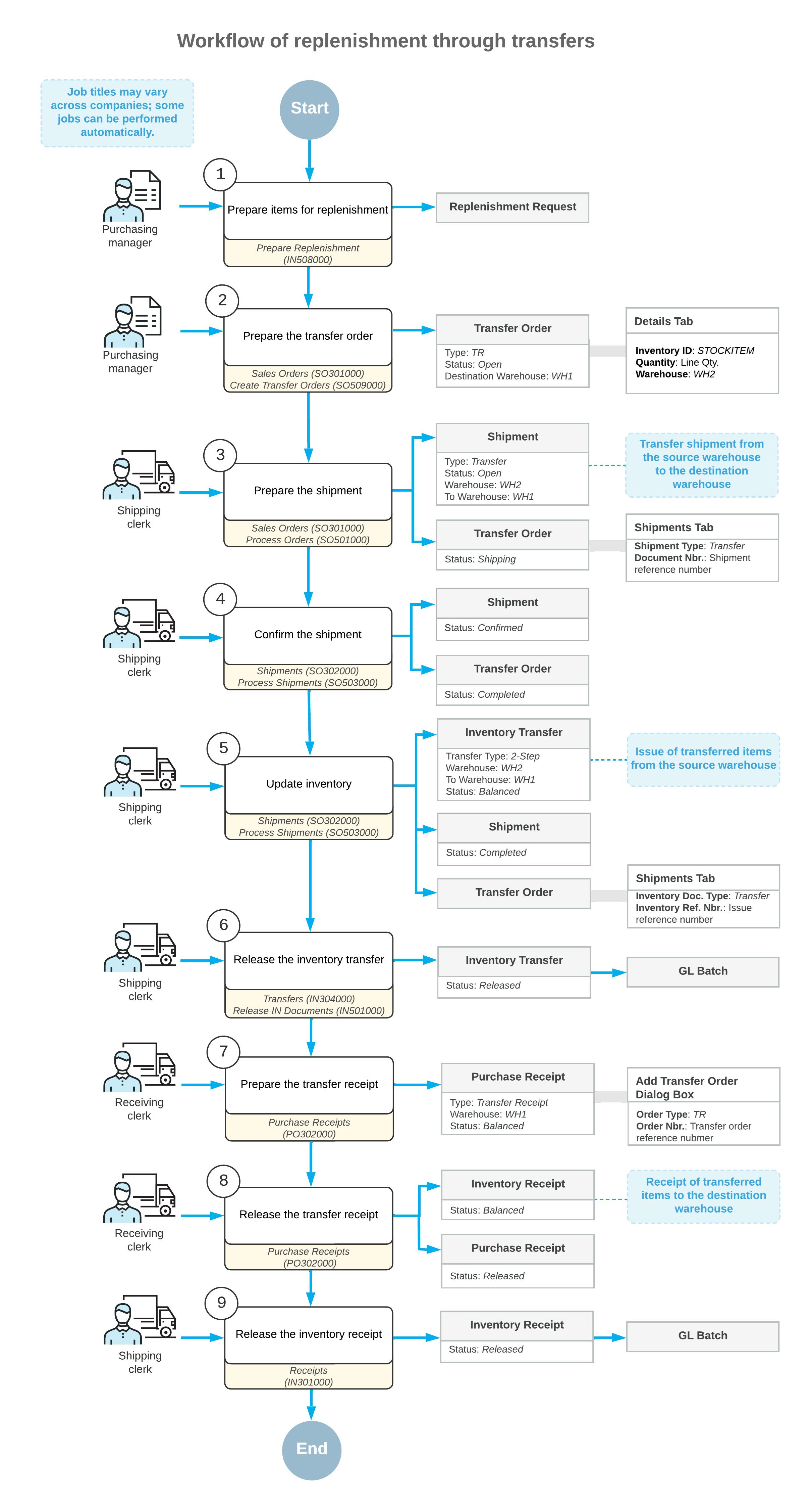 A general workflow of replenishment through transfers involves the steps and generated documents shown in the following diagram.