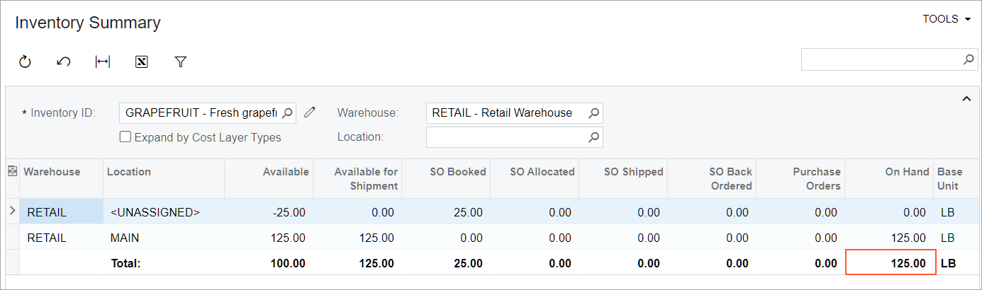 Notice that in the On Hand column, the quantity is 125, as shown in the following screenshot.