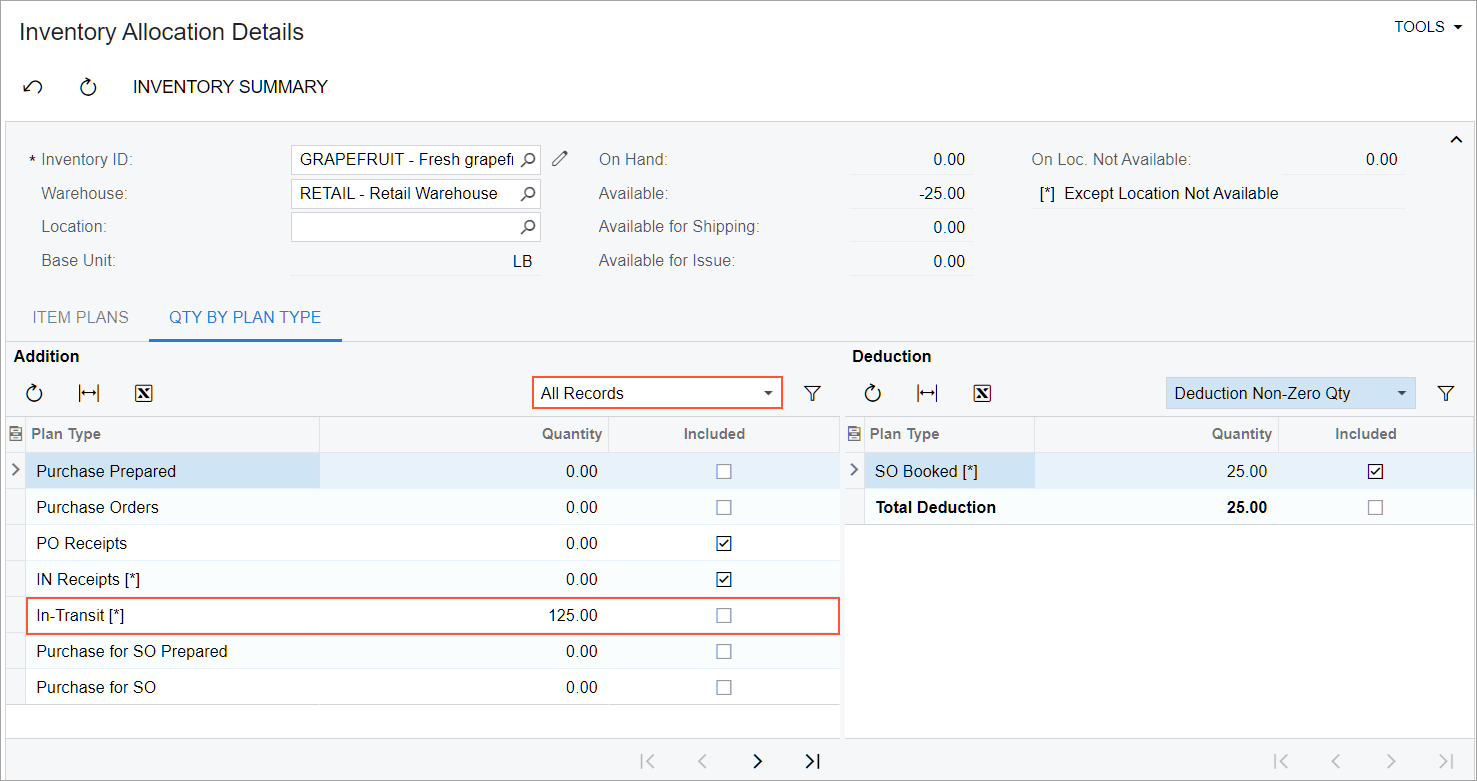 With these settings, you replenish grapefruit in the RETAIL warehouse by transferring the needed quantities of the item from the WHOLESALE warehouse. The GRAPEFRUIT stock item appears in the list of items for replenishment on the Prepare Replenishment (IN508000) form when you have 30 pounds (which is the base unit of measure for this item) or less of the item in stock. The Max Qty. value is used for the calculation of replenishment parameters in the RETAIL warehouse. For details, see Configuration of Replenishment: Replenishment Methods.