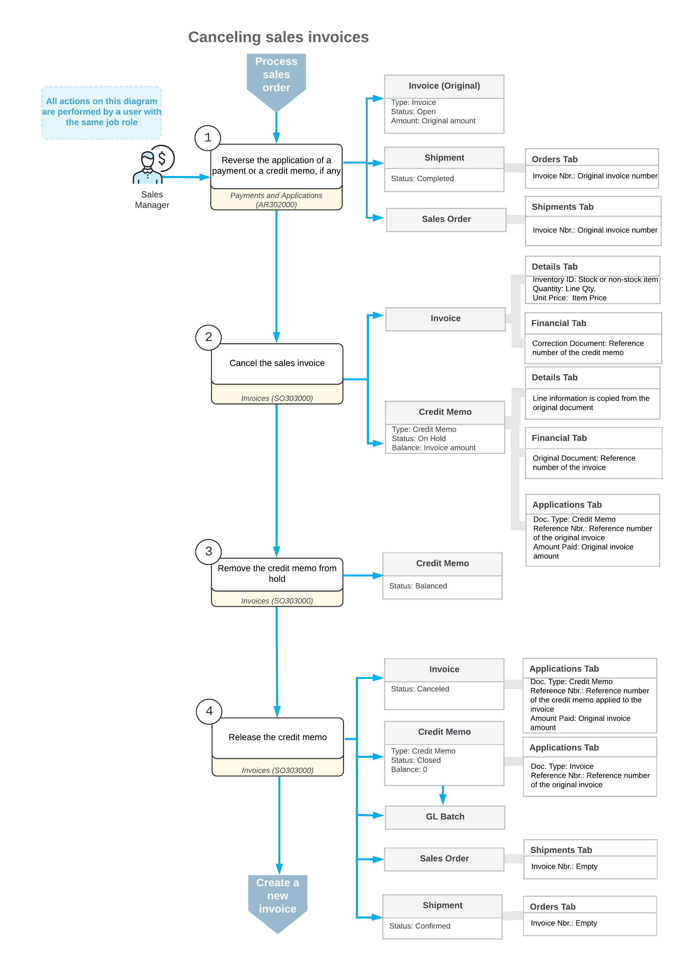 The following diagram illustrates the workflow related to the cancellation of a sales invoice.