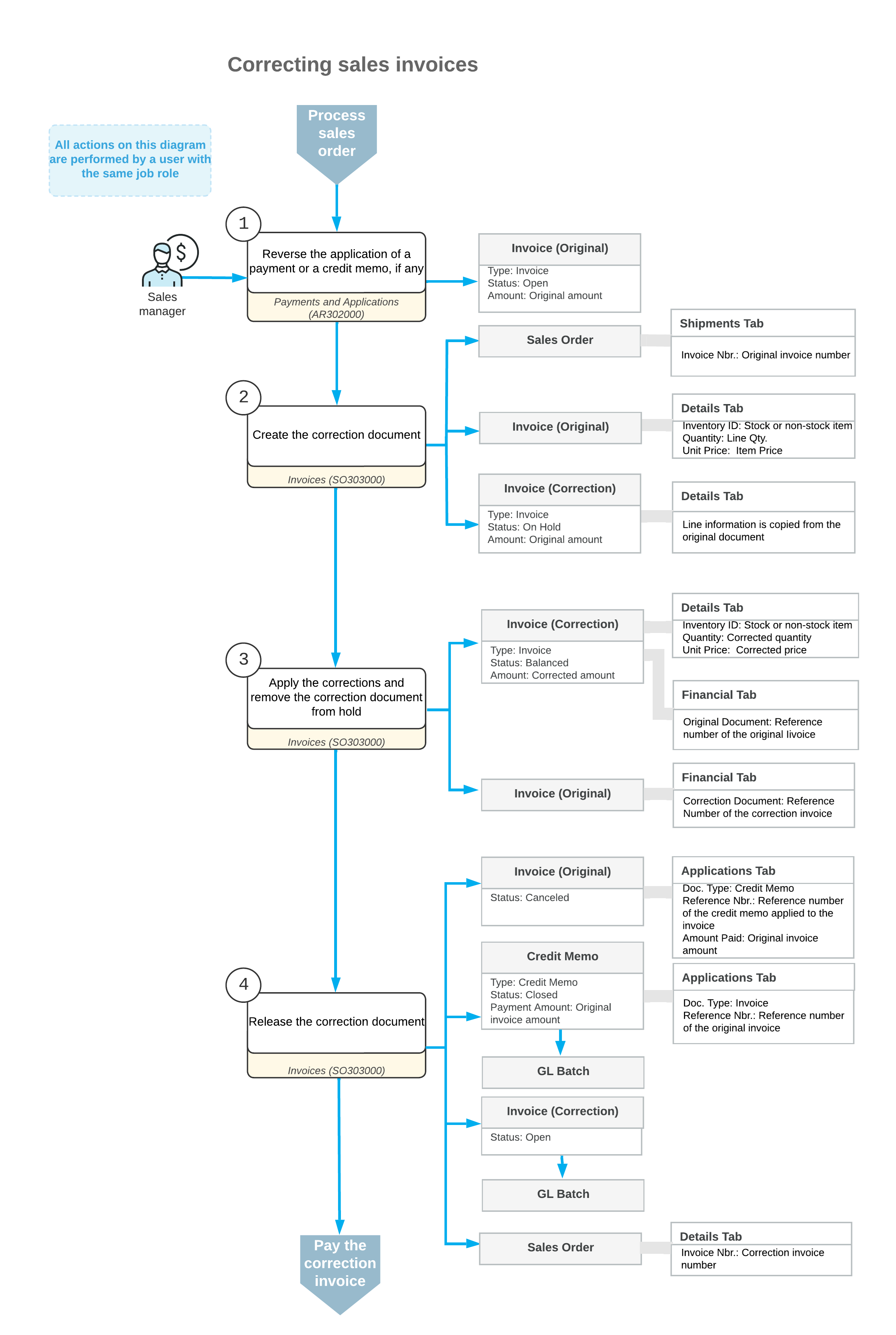 The following diagram illustrates the workflow related to the correction of a sales invoice.