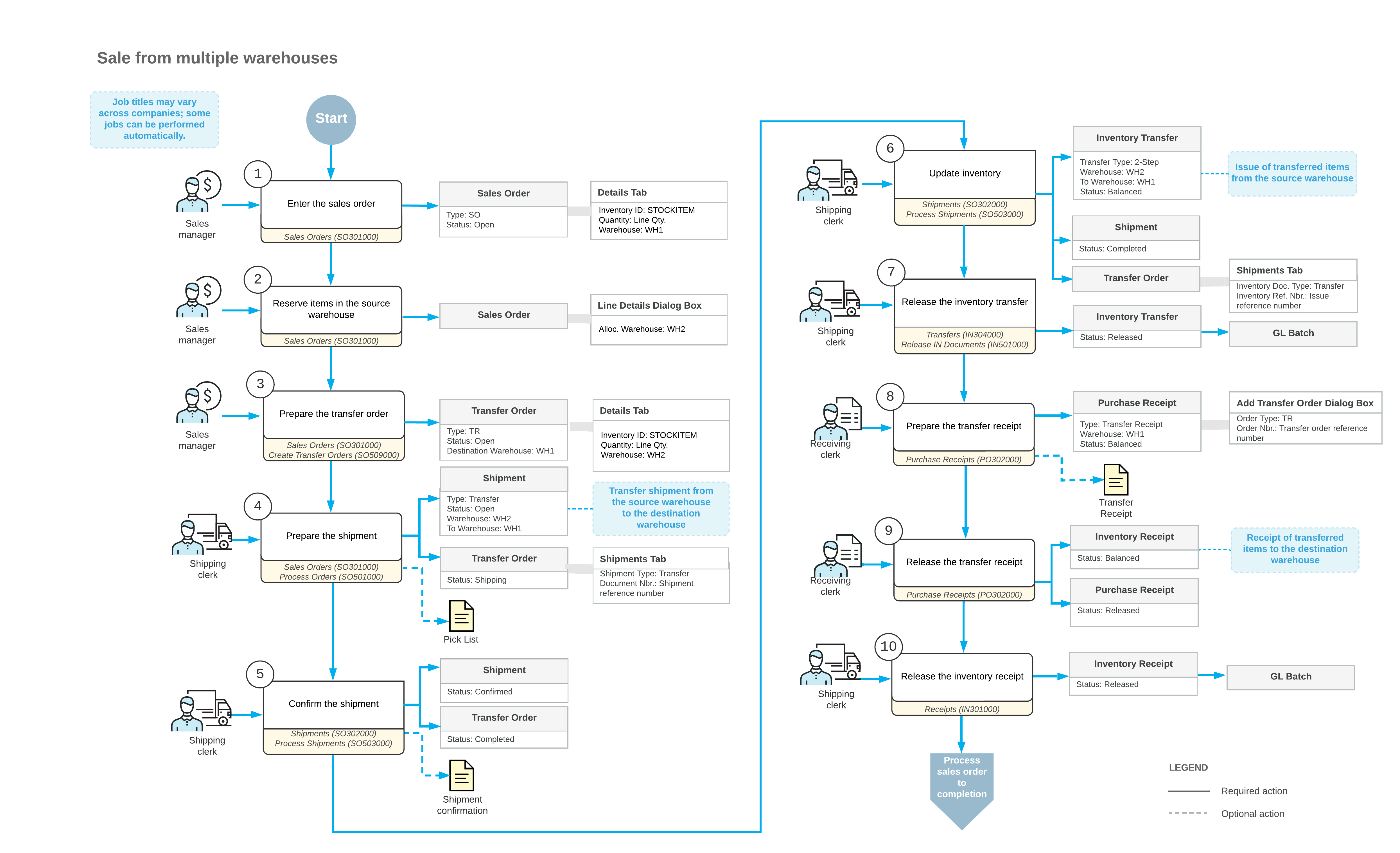 - Process a sales order after the items have been transferred to the destination warehouse.