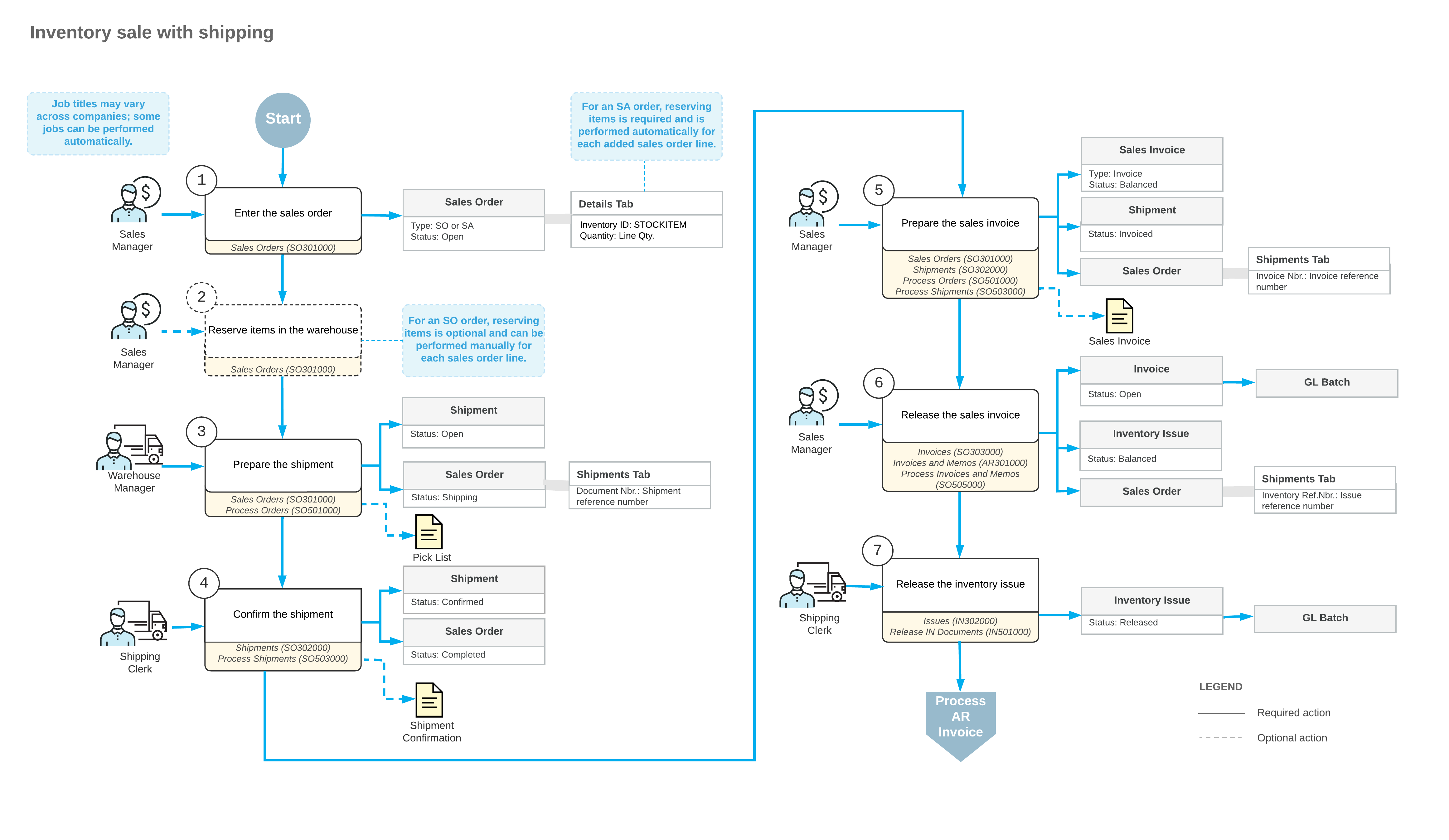 The standard sales process typically includes entering a sales order, processing a shipment of the items with items being issued from inventory, and preparing the related invoice to a customer. In MYOB Acumatica, to process a sale that requires the items to be shipped before an invoice can be prepared, you can use a sales order of the SO or SA type on the Sales Orders (SO301000) form. Consider the following points as you decide which of the order types to use: