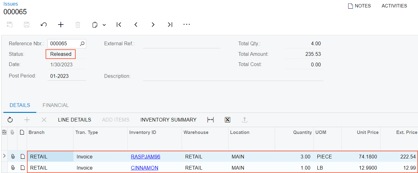- On the Shipments tab, in the only row, click the link in the Inventory Ref. Nbr. column to view the inventory issue that was generated when you released the invoice.