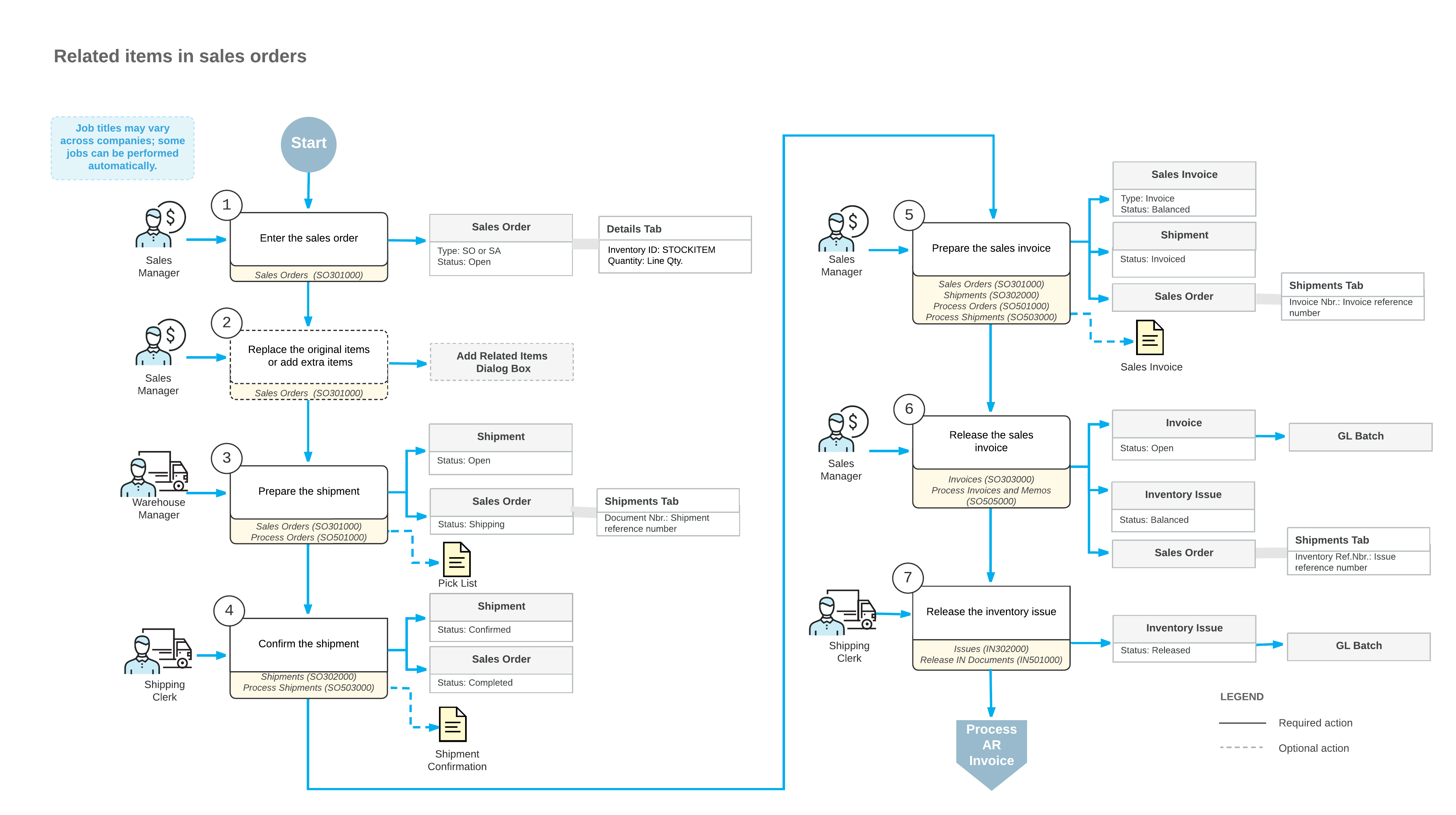 For sales that may include related items, the typical process involves the actions and generated documents shown in the following diagram.
