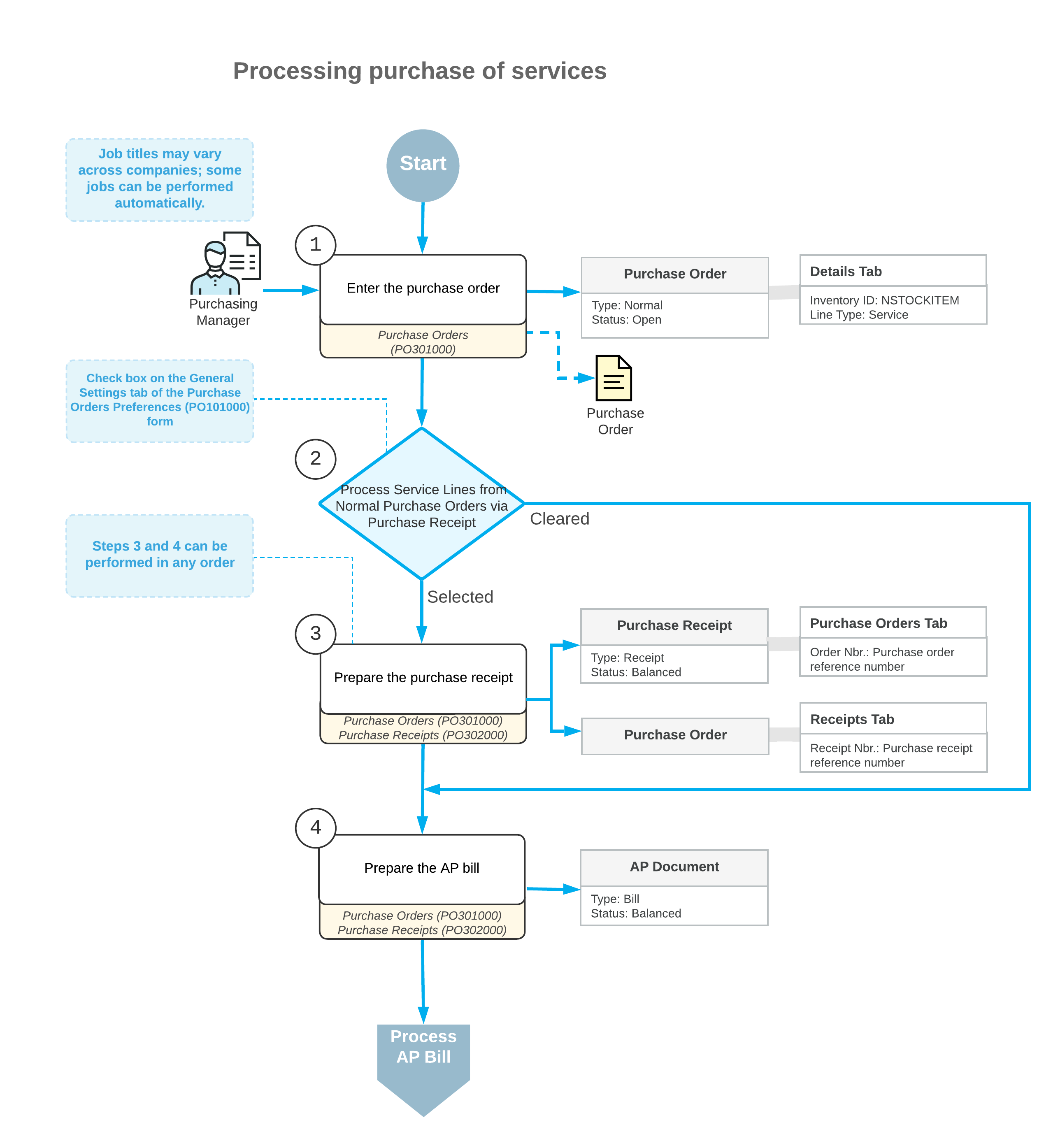 If the check box is cleared (the default setting), processing Service lines doesn't involve creating a purchase receipt; an AP bill (or multiple bills) has to be created directly from the purchase order (see Step 4). When a user creates a purchase receipt for a purchase order with lines of different types, some of which require receipt and some of which do not require receipt, the system does not copy Service lines to a purchase receipt that is prepared from this purchase order. Also, in this case, Service lines cannot be added to the purchase receipt manually.