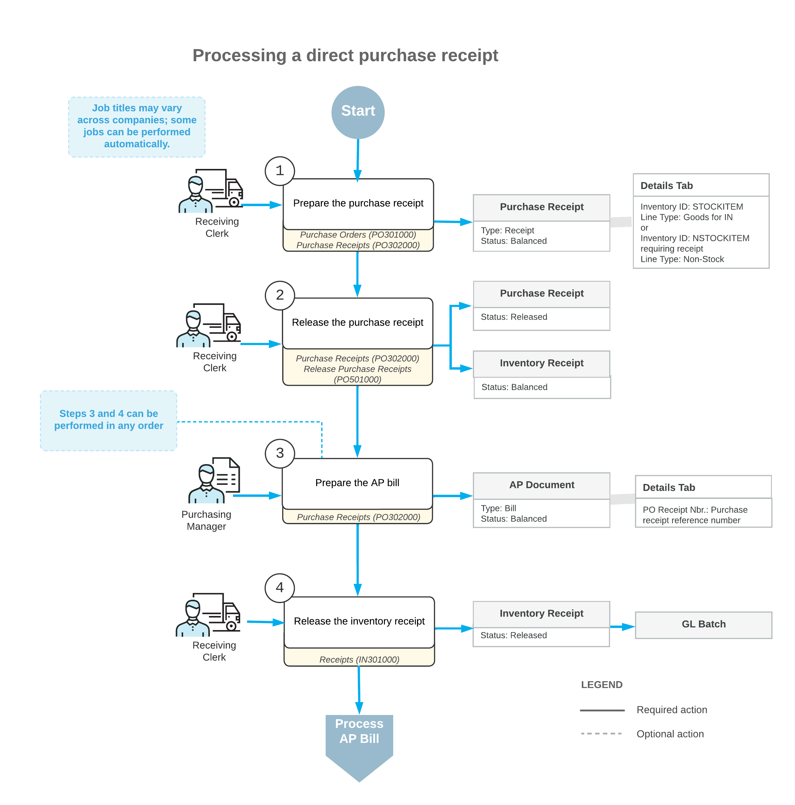 The following diagram represents the general workflow of processing a direct purchase receipt.