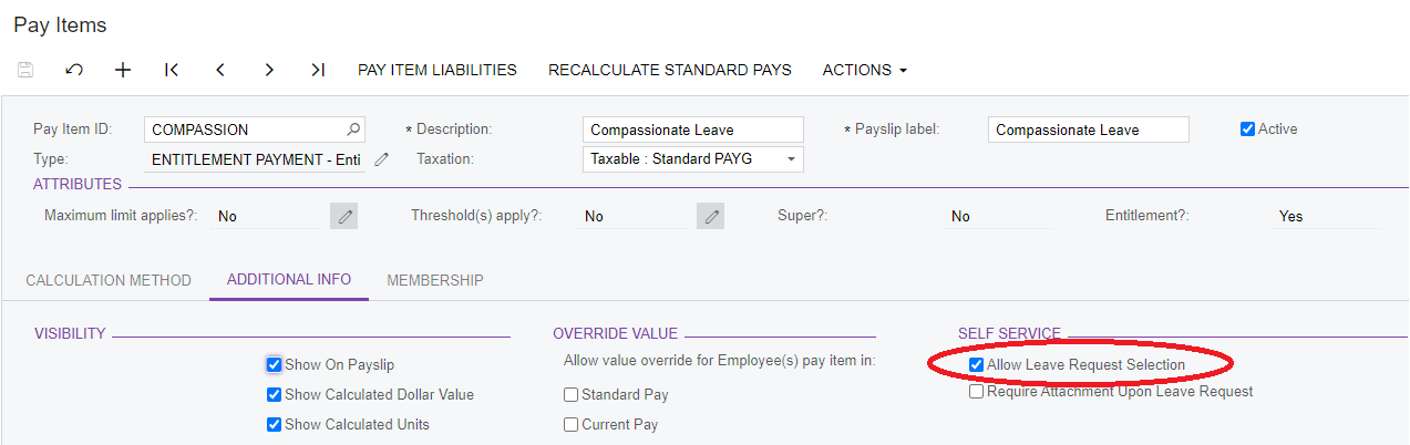 In the Additional Info tab, select the Allow Leave Request Selection checkbox in the Self Service section. This allows employees to submit a leave request of this type in the ESS.
