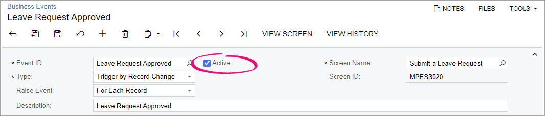 You can notify employees when their requests are approved or declined by using business events. Two notifications are provided on the Business Events form (SM3020PL): Leave Request Approved and Leave Request Declined. To use these notifications, make sure you've enabled the business events feature, then set the notifications as active.