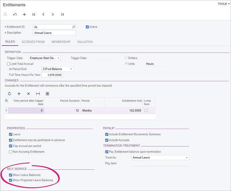 Note: If you select Non Accruing Entitlement, all employees can see their balances for this entitlement. For accruing entitlements, employees can only see their balances if they have a linked accrual pay item in their standard pay. -