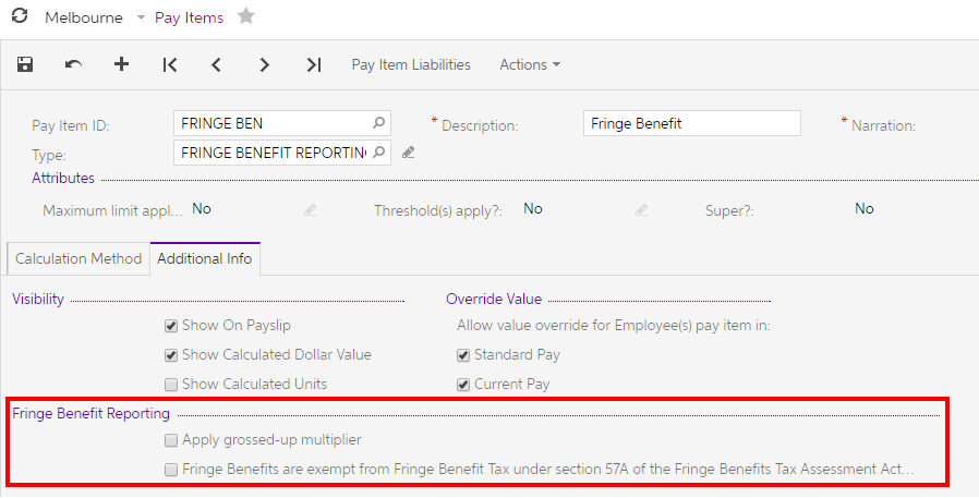 - The item's ATO Category on the Pay Item Liabilities form (MP.PP.10.25) is set to "Reportable fringe benefits amount".